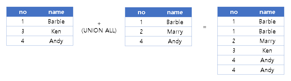 UNION ALL : 각 쿼리의 모든 결과를 포함한 합집합 (중복제거 안함)